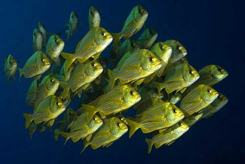 Although we did make it across the river, the delay had us arriving past sunset so we were unable to meet with Eréndira Valle, Executive Director of the Amigos to get briefed on local monitoring efforts and how we could get involved. Fortunately, Abraham arrived early the next morning along with Olmo Romero Vargas to bring us up to speed on local monitoring efforts and inform us how we could help. We learned of existing monitoring programs and were asked to help generate species lists (something Bob was already doing) and abundance/size data for key food fish species. Unfortunately, assessing abundance and size of food fish species is quite easy to do in most places in the world as food fish numbers are generally low and fished species tend to avoid divers. In Cabo Pulmo, however, I found myself taxed to the limits of my fish counting abilities. Huge schools of leopard grouper (with individuals up to 1m long) co-mingled with literally hundreds of barred pargo, graybar grunts, panamic parkfish, and huge dog snapper with absolutely no fear of divers.