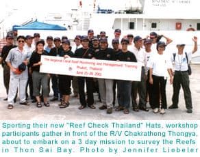 The Reef Check Regional Training Center at the Phuket Marine Biological Center (PMBC) hosted its first international training from June 25-30th. Participants included representatives from Indonesia, Cambodia, China, Vietnam and Thailand. Dive shop operators from Thailand, Indonesia, and Malaysia also attended, along with volunteers from England, Canada, and the USA. PMBC senior scientist, Dr. Hansa Chansang, Thai RC coordinator Pinya Sarasas, and RC Thailand scientist Niphon Phongsuwan, received awards from RC Program Manager Jennifer Liebeler for their dedication and work in setting up the regional training center. Special thanks to the Thai Department of Fisheries for donating the R/V Chakrathong Thongya for use during the workshop. Workshop participants spent three days aboard the research vessel, conducting training and Reef Check surveys on the reefs in Thon Sai Bay, Phi-Phi Island, in the Gulf of Thailand. All participants are now certified as Reef Check trainers and will be expanding Reef Check monitoring, education, and management programs in their respective countries. The workshop was funded by a grant from the USAID/US State Department East Asia Pacific Environment Program. The next regional training will be held in December 2001, contact RC headquarters or Pinya Sarasas, Pinya@visto.com for more information or to sponsor a participant.